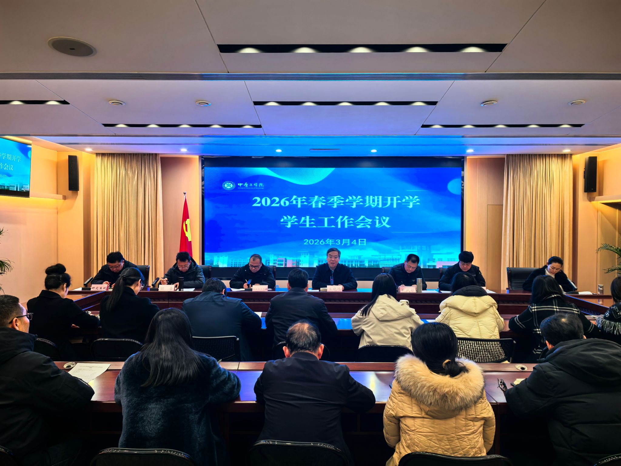 2026年3月4日下午,党委副书记、工会主席宋晓炜主持召开2026年春季学期开学学生工作会议,对春季开学工作和本学期学生工作进行安排部署。会上党委统战部长张东伟进行了民族宗教政策宣讲,对学生宗教“双防”工作进行了布置。(通讯员 李龙)